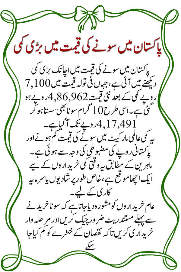The drop mainly happened because of a slowdown in international gold markets along with improved stability of the Pakistani Rupee against the US Dollar.
