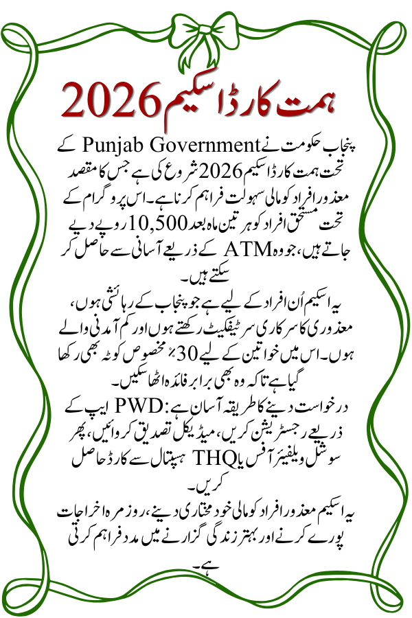 The Himmat Card for Special Persons 2026 is a strong support system for special persons in Punjab. With a quarterly payment of 10,500 PKR and a dedicated quota for women, the scheme promotes financial stability and independence. The digital registration system and ATM-based payments make the process easy and accessible. If you meet the eligibility criteria, applying for this program can help improve your quality of life and provide long-term support.