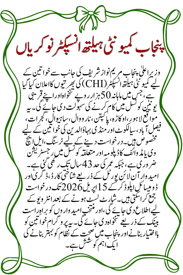 Position NameMaryam Nawaz Community Health Inspector (CHI) Jobs