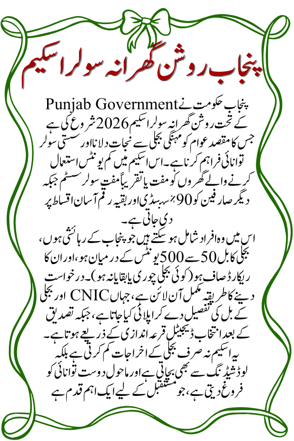 The Punjab Roshan Gharana Solar Scheme is a large-scale renewable energy project designed to give energy independence to millions of residents. In 2026, the scheme has been expanded to include more households under the subsidized category, making solar technology more accessible to the middle class. The government has partnered with leading international solar manufacturers to supply durable panels and high-efficiency inverters. This initiative is not just short-term relief but a long-term investment in strengthening the province’s power system and reducing dependence on traditional thermal energy sources. By joining the scheme, households can enjoy a steady electricity supply, especially during peak summer months.